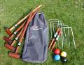 Spelet består av 4 klubbor tillverkade av mahogny, stål och gommiklädd träffyta 2 målpinnar 9 bågar 4 bollar Spelet förvaras i en snygg och praktisk bag